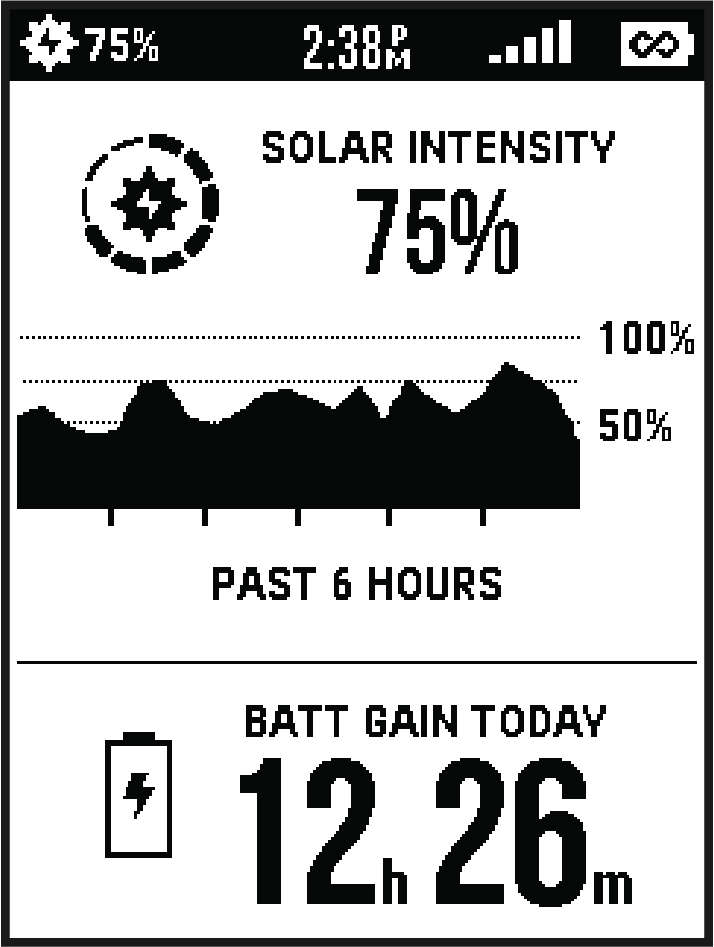 The device goes into a low power, battery charging mode, and a screen with solar charging statistics appears. The display turns off automatically when sunlight is no longer detected.