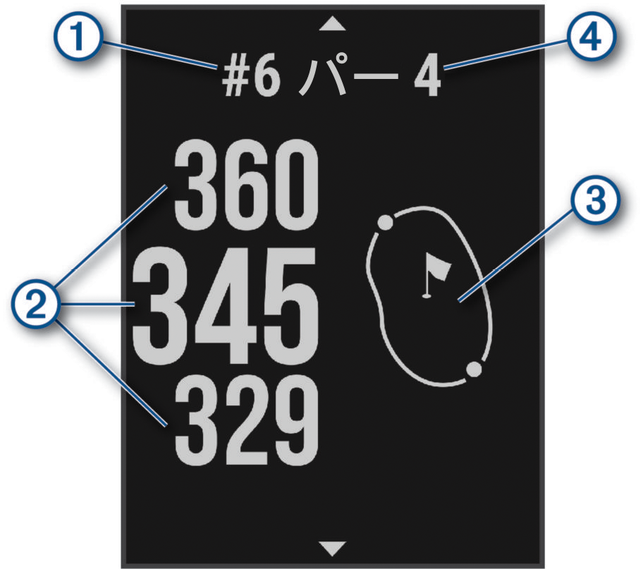 注意:画面に表示されている数字は、グリーンの奥/ 中央/ 手前までの距離を示します。実際のグリーン上のピンの位置までの距離を表すものではありません。ピン位置を手動で変更すると、変更後のピン位置を基に距離が更新されます。
