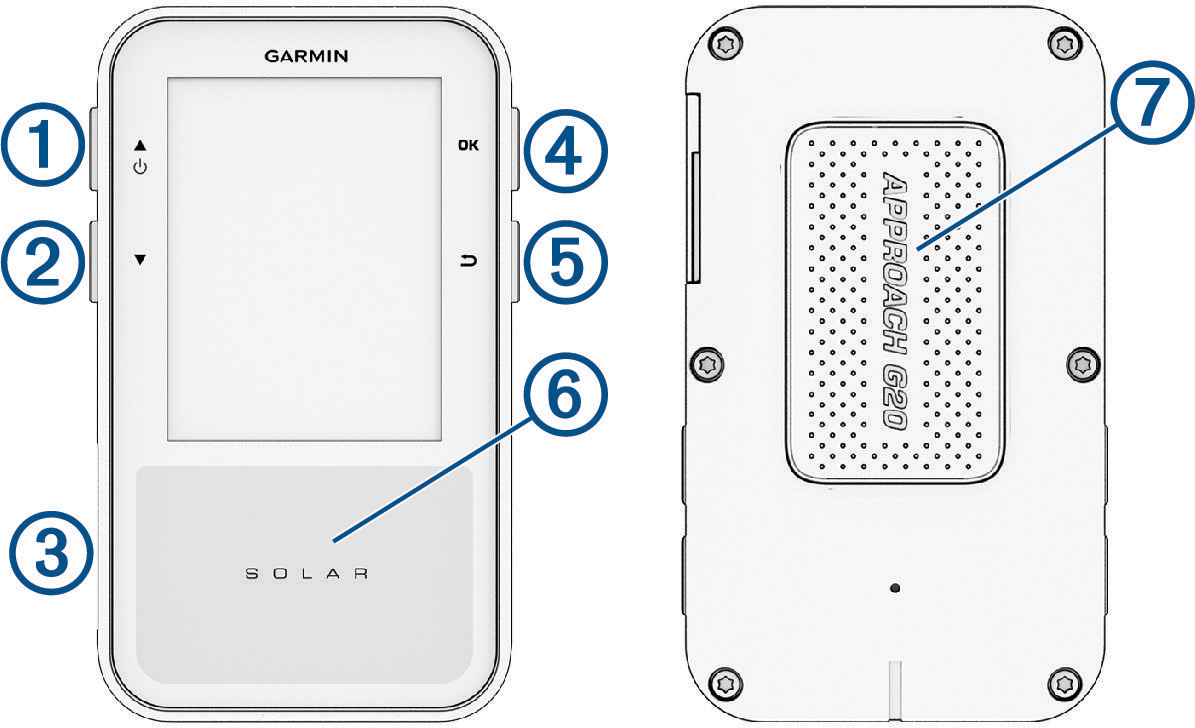 長押し:電源オン/オフ、電源オプションを表示( 電源オプション) 押す:メニュー/オプション/設定をスクロール ラウンド中に押す:ハザード/レイアップ/ドッグレッグなどをスクロール |