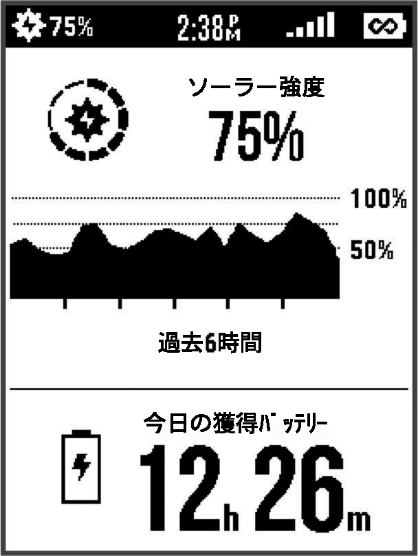 電源オフ時のソーラー充電 日光が当たる場所にデバイスを置きます。 を長押しして電源オプションを表示します。 [電源オフ]を選択します。デバイスが低電力のバッテリー充電モードに切り替わり、画面にソーラー充電の統計情報が表示されます。日光が検出されない状態が続くと、ディスプレイはオフになります。注意:システム設定で、ソーラー充電画面の表示のオン/オフを設定できます。( システム設定) ホームはじめにソーラー充電電源オフ時のソーラー充電