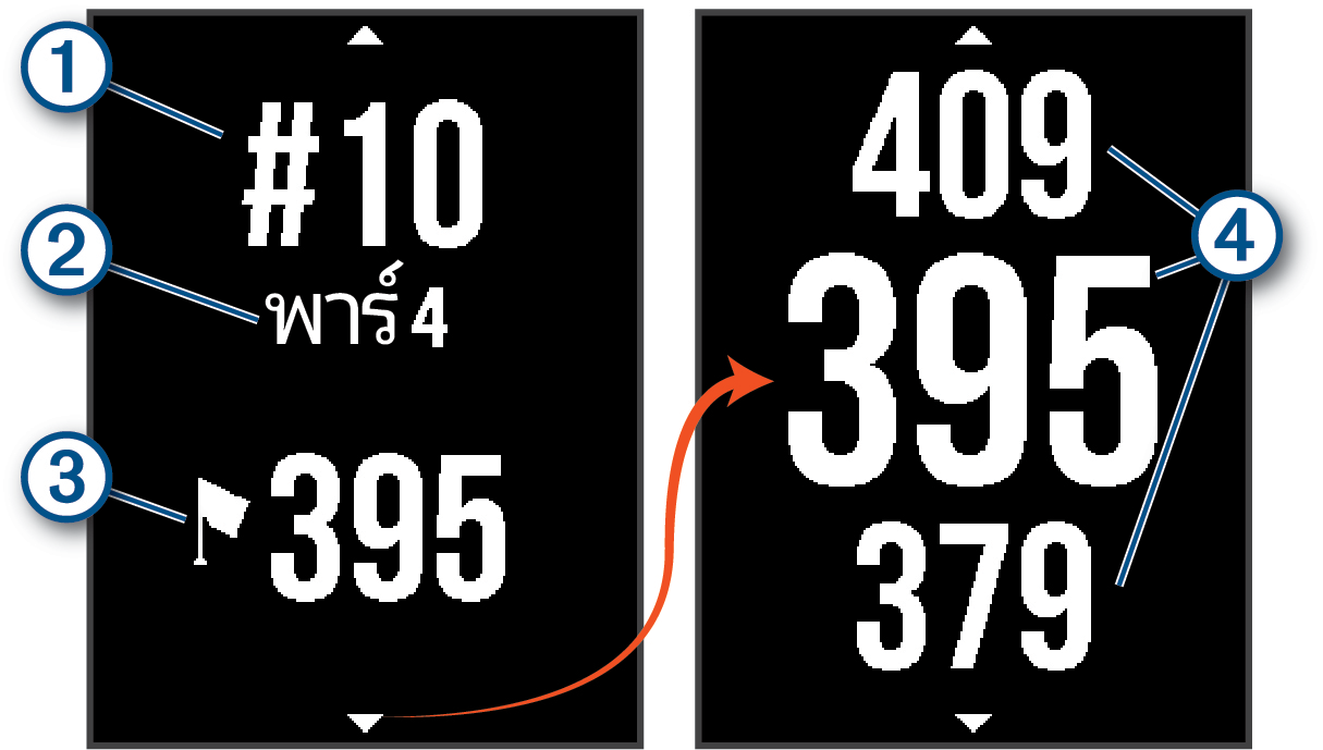 : คำนวณระยะทางไปยังด้านหน้า ตรงกลาง และด้านหลังของกรีน