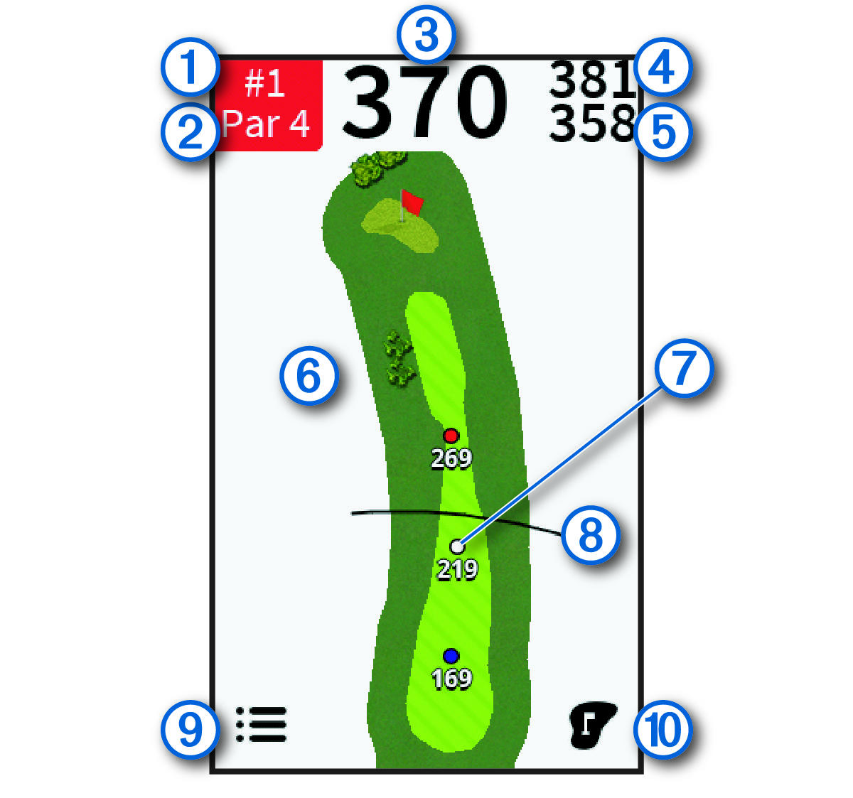 장치에 플레이 중인 현재 홀이 표시됩니다.