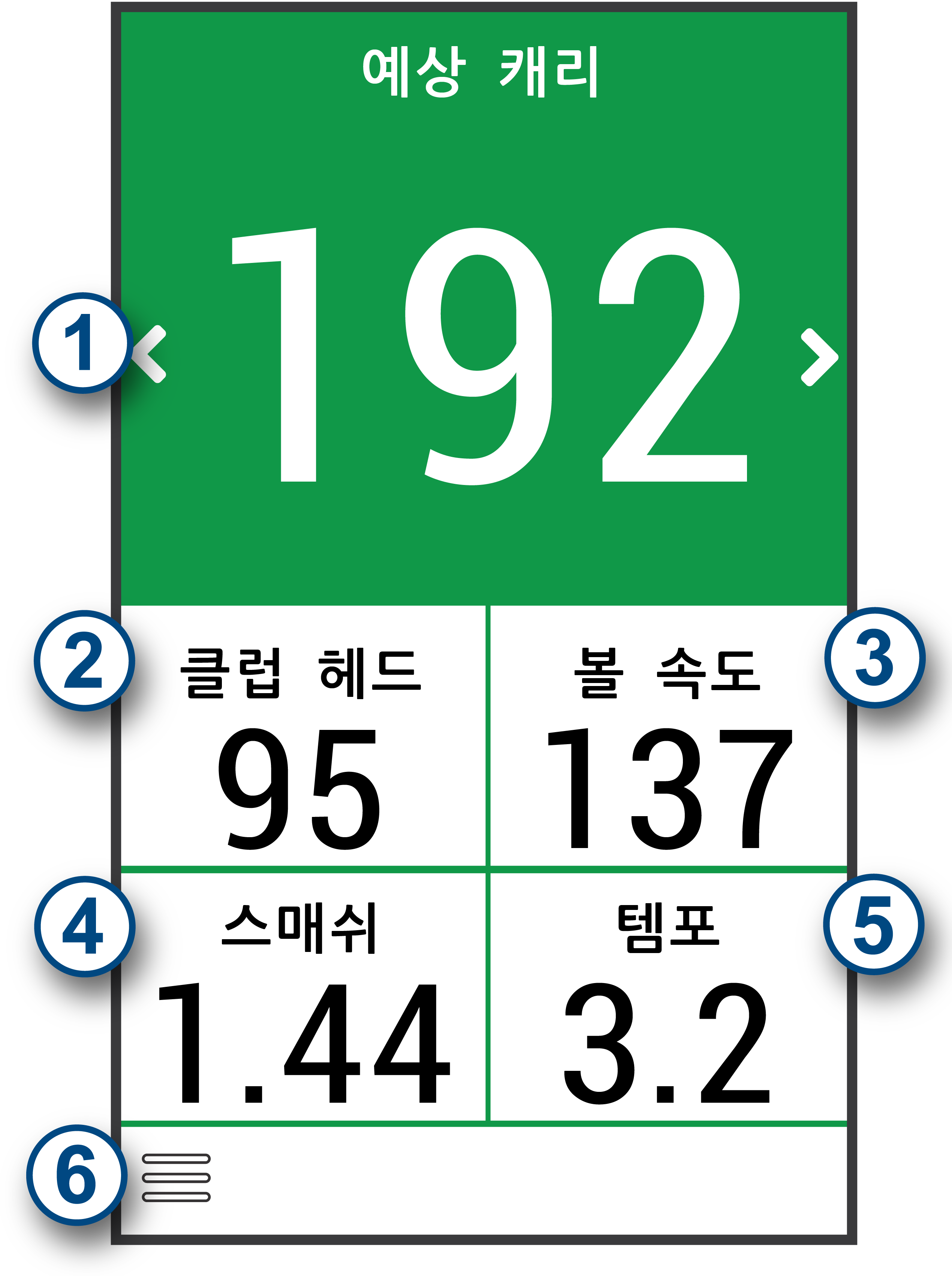 예상 캐리(비거리) 또는 예상 캐리 + 롤을 표시합니다. 이것을 선택하면 표시되는 스윙 지표가 변경됩니다. |