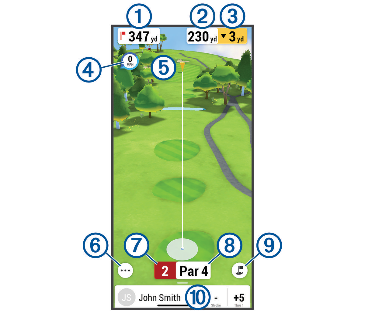 Displays the distance to the hole. |