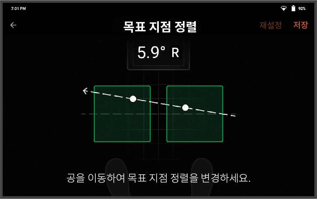 타켓 정렬 조정하기연습 세션 중에는 기본적으로 타깃 정렬이 0도로 설정되어 있습니다. 타깃 정렬을 왼쪽 또는 오른쪽으로 최대 15도까지 조정할 수 있습니다. 연습 세션 중에 > 타깃 정렬을 선택하세요. 필요한 경우 재설정을 선택하여 타깃 정렬을 0도로 다시 설정하세요. 런치 모니터의 디스플레이에 표시된 두 영역 각각에 공을 놓으세요. 볼을 움직여 타깃 정렬을 조정하세요. 저장을 선택하세요. 홈골프 시뮬레이터 기능 사용하기연습타켓 정렬 조정하기