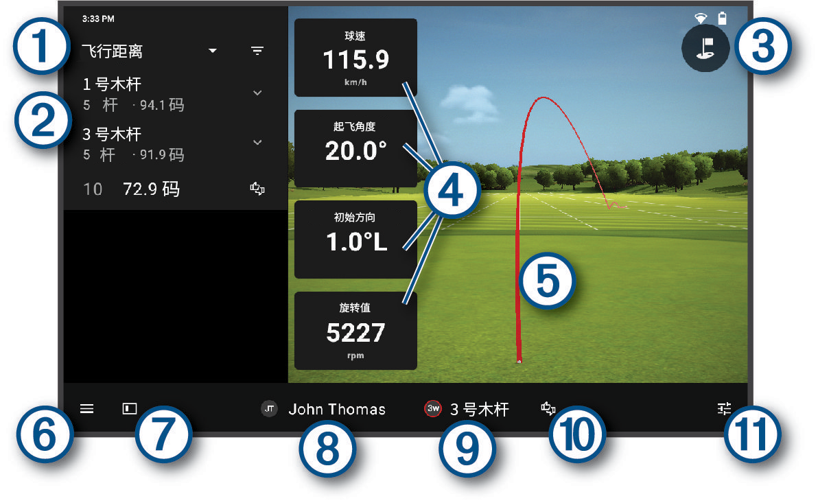 所选挥杆的相应高尔夫数据。向上滑动可浏览完整数据列表 提示:您可以点选一个高尔夫数据,使该页面显示其他数据 提示:您可以点击并长按高尔夫数据,查看对应数据说明 |