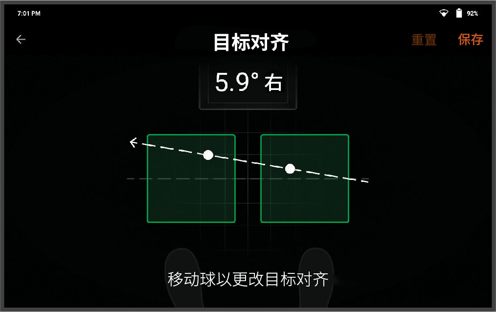 调整目标对齐练习期间,目标对齐默认设置为 0 度。您可以向左或向右调整目标对齐,最高可设置为 15 度。 练习期间,选择 > 目标对齐。 如有需要,可选择重置,将目标对齐设置为 0 度。 依设备屏幕上显示的对应两个区域,分别放置一个高尔夫球。 移动高尔夫球以调整目标对齐。 选择 保存。 主页 高尔夫模拟功能练习调整目标对齐