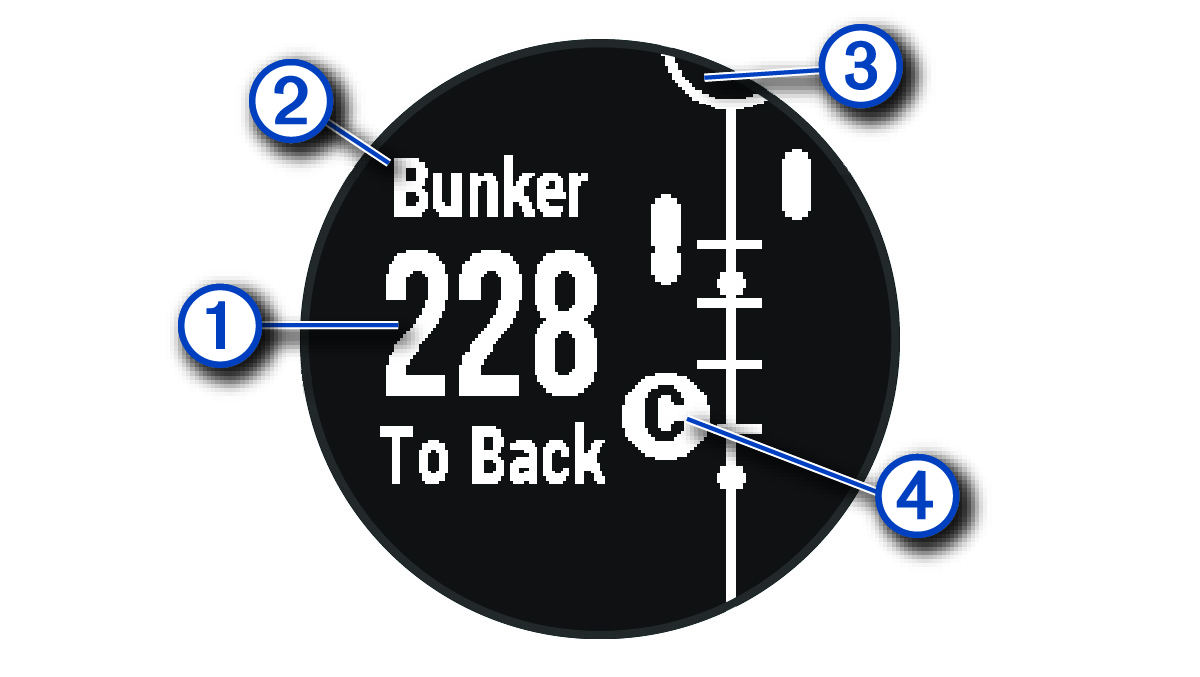 : For large hazards, the distances to the front and back of the hazard appear on the screen.