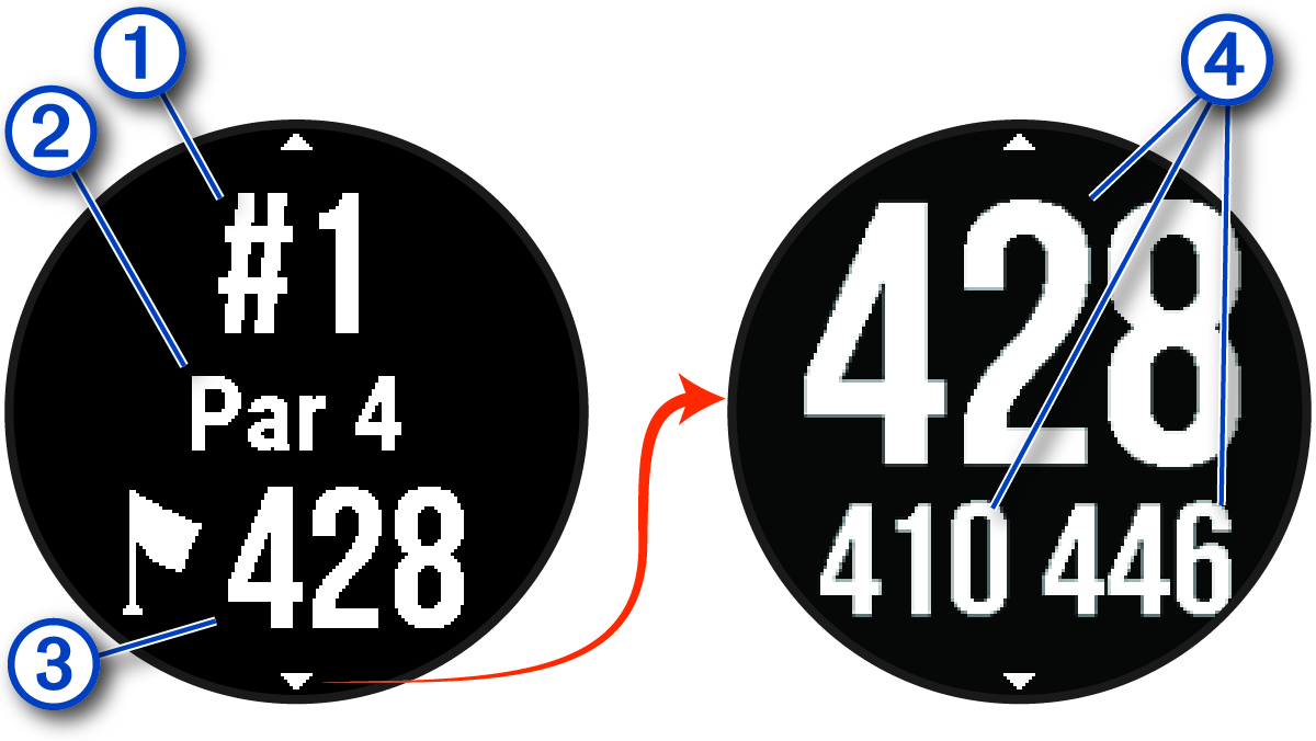 LƯU Ý: Bạn có thể nhấn DOWN để xem tất cả khoảng cách đến vùng green.
