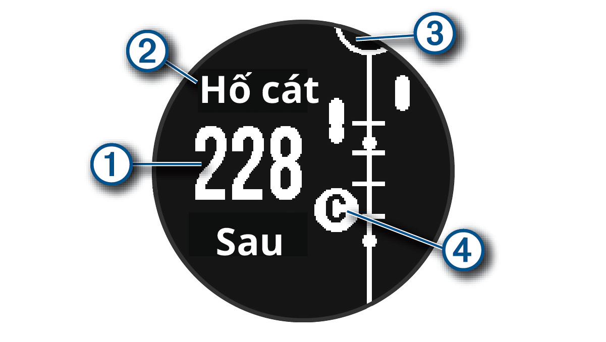 : Đối với các chướng ngại vật lớn, khoảng cách từ phía trước và phía sau của mối nguy hiểm xuất hiện trên màn hình. Đối với các chướng ngại vật nhỏ, lỗ golf thẳng và lỗ golf uốn cong, khoảng cách đến các đối tượng sẽ xuất hiện.
