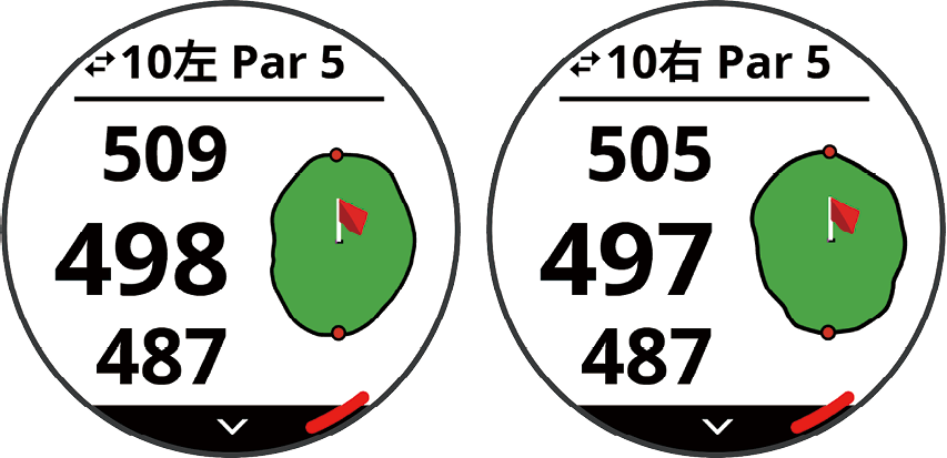 双果岭切换在某些亚洲的高尔夫球道,会有双果岭的设计,两个果岭通常相距不远,为了区分通常称为“左”和“右”果岭,以方便球友辨别。如果设备当前显示的果岭并非你的目标果岭,可在 S40 上手动切换。点击屏幕顶端左边的箭头 可切换左右两侧的果岭。主页打高尔夫球洞信息双果岭切换