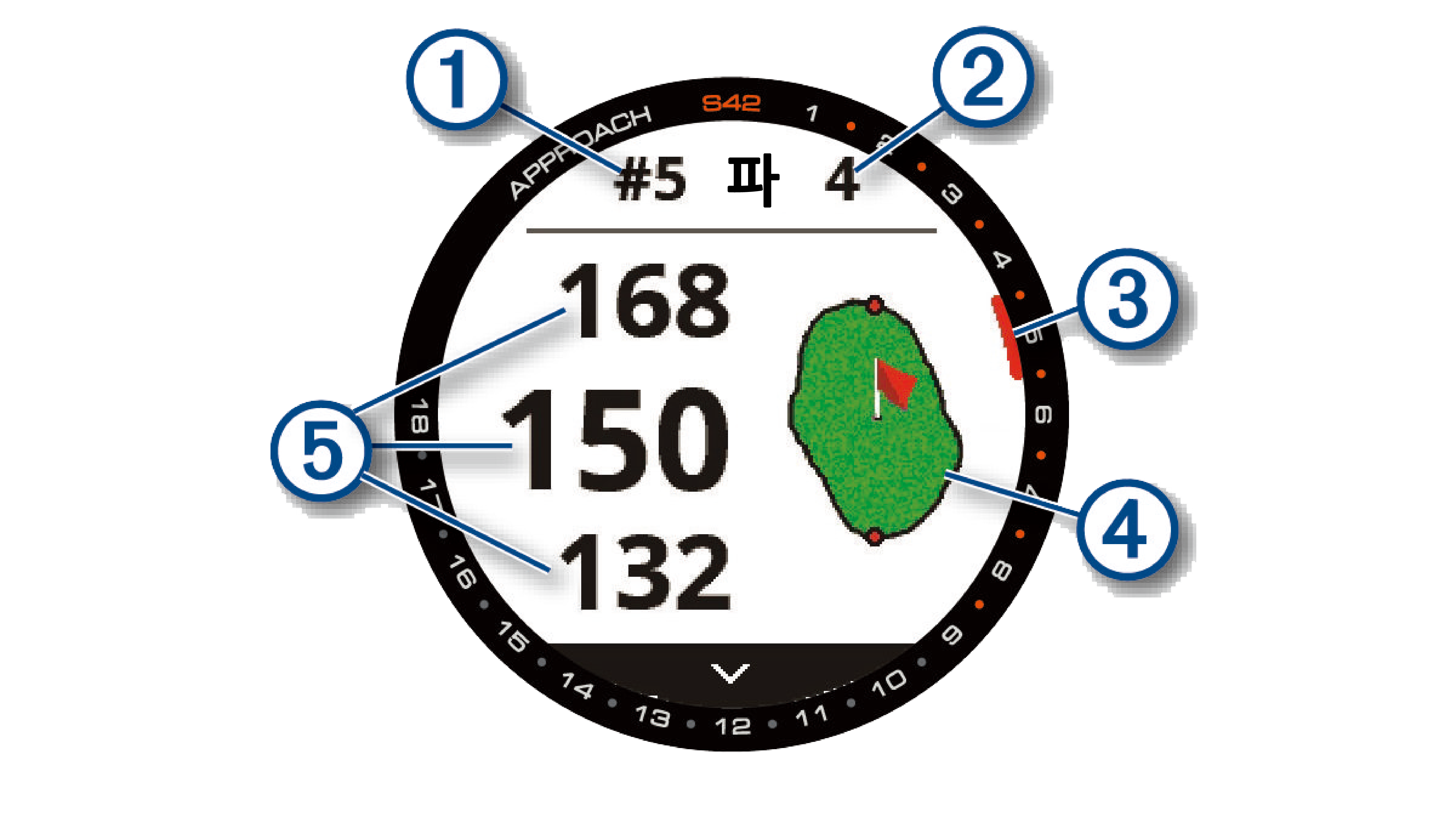 장치는 현재 플레이 중인 홀을 보여주며, 새로운 홀로 이동하면 자동으로 홀을 전환합니다. 사용자가 홀에 위치하지 않는 경우 (예를 들면 클럽하우스에 위치하는 경우), 장치의 홀은 기본적으로 홀1로 설정됩니다. 홀 뷰 화면에서 홀을 수동으로 변경할 수 있습니다(3 페이지, 홀 변경하기).