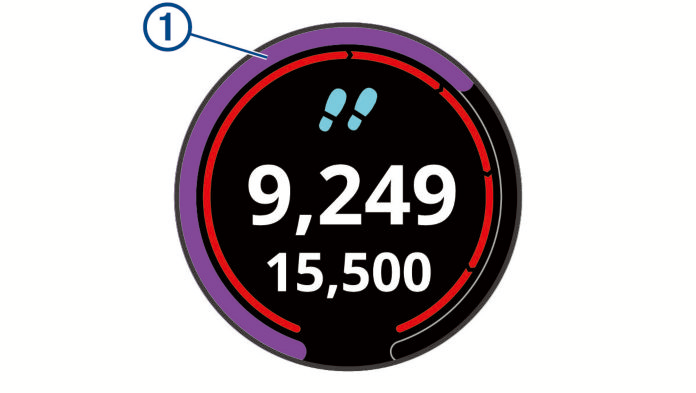 자동 목표이전 활동 수준을 기준으로 장치에서 자동으로 일일 스텝 목표를 만듭니다. 하루 동안 움직임에 따라 장치에서 일일 목표①에 대한 진행 상황을 보여줍니다.자동 목표 생성 기능을 사용하지 않기로 선택하였다면, Garmin Connect 계정에서 자신만의 사용자 지정 단계 목표를 설정할 수도 있습니다.홈위젯운동량 측정자동 목표