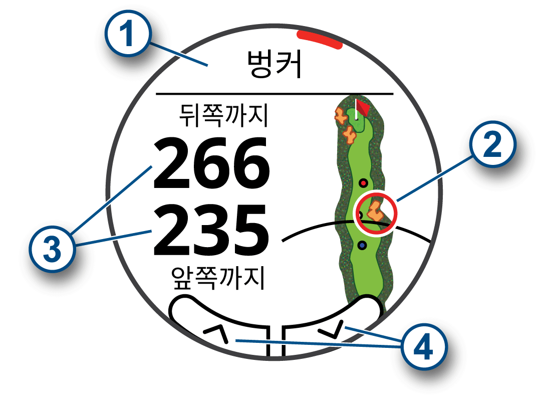 지도를 탭하여 현재 홀의 해저드와 레이업을 볼 수 있습니다.