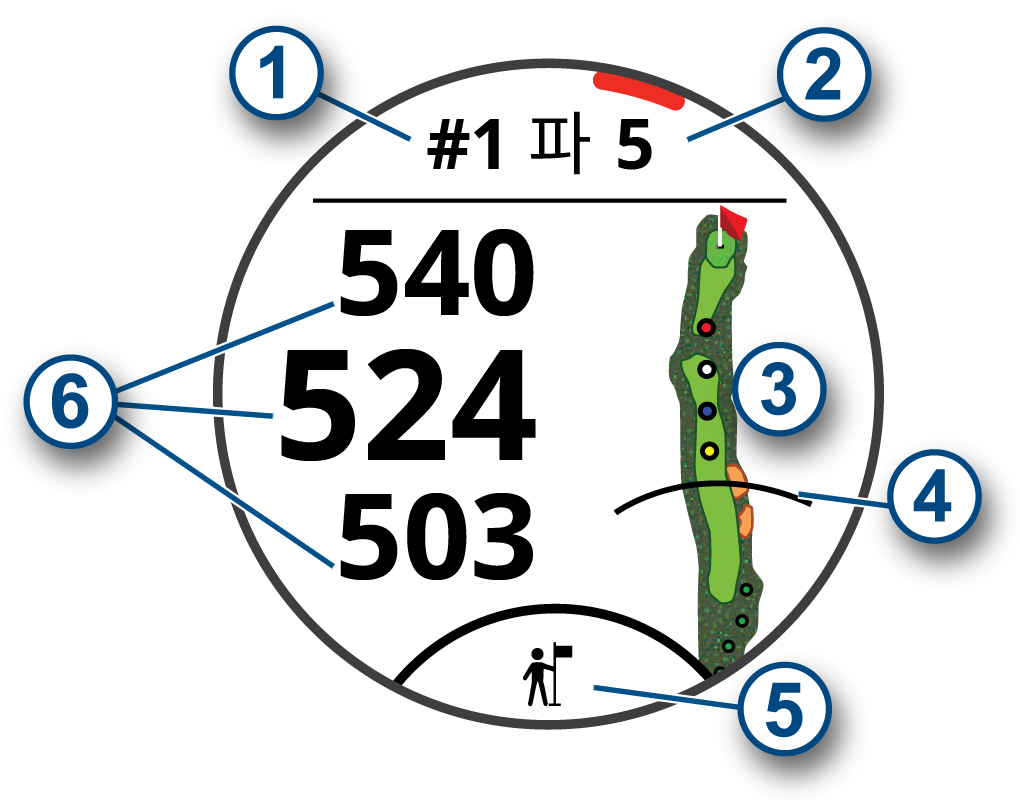 장치에 플레이 중인 현재 홀이 표시되며, 새로운 홀로 이동하면 자동으로 전환됩니다. 사용자가 홀에 위치하지 않는 경우 (예를 들면 클럽하우스에 위치하는 경우), 장치의 홀은 기본적으로 홀1로 설정됩니다. 사용자는 홀을 수동으로 변경할 수 있습니다 (4 페이지, 홀 변경하기).