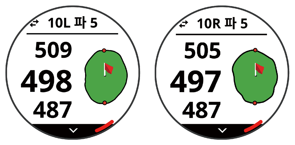 얼터네이트 그린특정한 골프 코스에서는 홀이 투 그린에 설치되어 있으며 같은 티잉 그라운드를 공유하고 있습니다. 이 투 그린은 보통 옆으로 나란히 있고 있으며 사용자가 쉽게 구분하기 위해 사용자의 시각에서 상대위치를 기준으로 각자 좌그린과 우그린으로 불립니다.화면좌측 상단에 위치한 아이콘을 터치하여 좌/우 그린을 전환할 수 있습니다. 홈골프 치기얼터네이트 그린