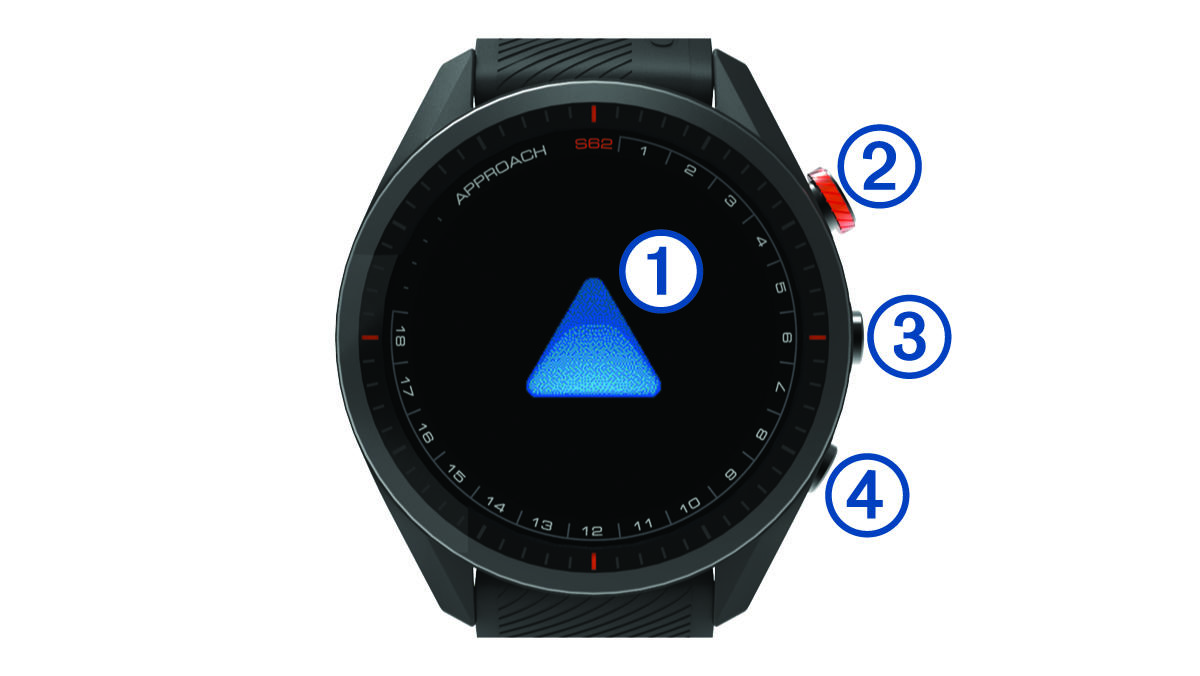 장치 개요① 터치스크린화면을 밀거나 탭합니다.② 액션 버튼골프 라운드를 시작하려면 누르세요.③ 메뉴 버튼장치를 켜려면 길게 누르세요.컨트롤 메뉴와 시계 설정을 보려면 길게 누르세요.장치를 끄려면 길게 누릅니다.④ 뒤로 가기 버튼이전 화면으로 돌아가려면 누르세요.홈소개장치 개요
