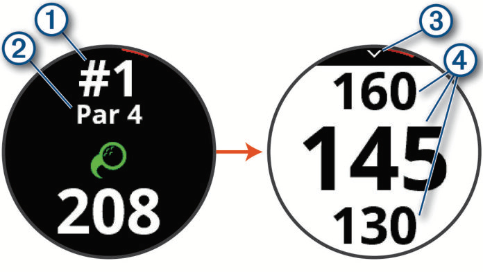 그린 앞, 중간, 뒤까지의 거리를 계산합니다. 탭하여 PlaysLike 거리를 볼 수 있습니다 (3 페이지, PlaysLike 거리 아이콘). |