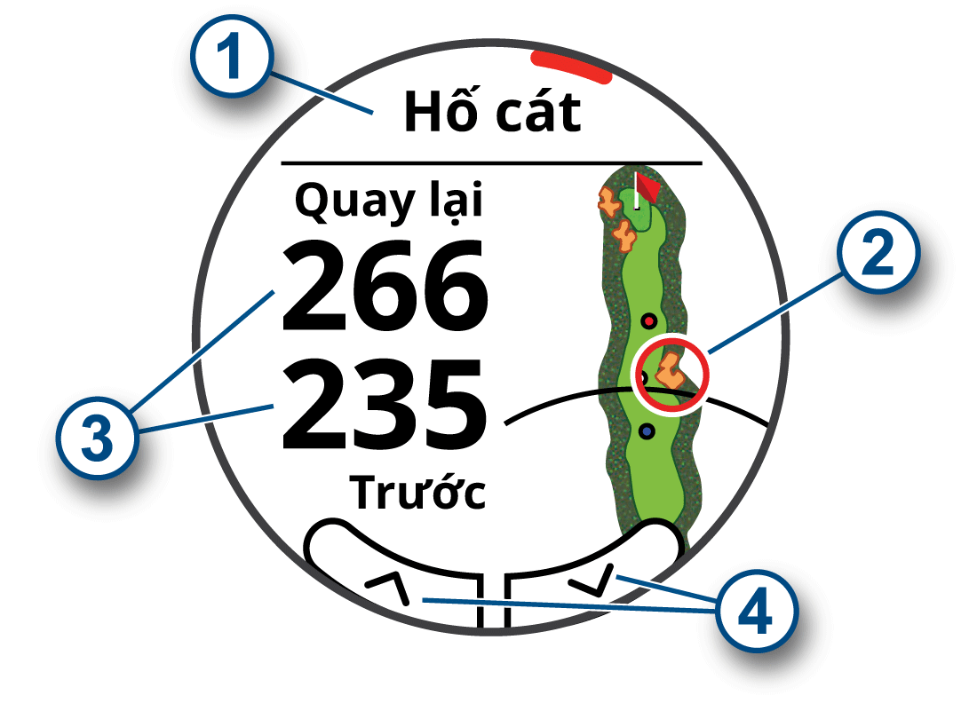 Khoảng cách đến lỗ golf thẳng hoặc đến phía trước và phía sau của chướng ngại vật. |