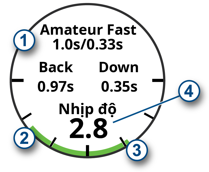 Bạn có thể đạt được nhịp độ lý tưởng 3.0 khi sử dụng những thời điểm xoay người đánh bóng khác nhau, ví dụ, 0,7 giây/0,23 giây hoặc 1,2 giây/0,4 giây. Mỗi người chơi golf có thể có nhịp độ xoay người đánh bóng riêng dựa trên khả năng và kinh nghiệm của họ. Garmin cung cấp sáu thời điểm khác nhau.