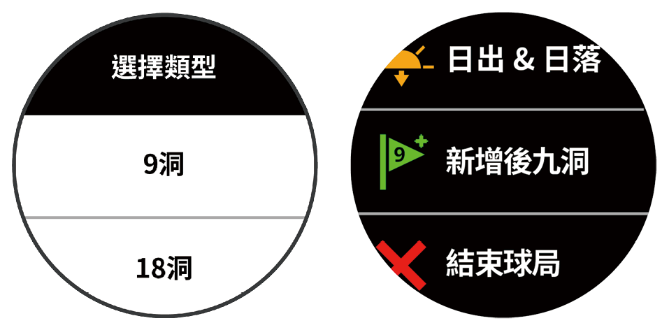 9+9 洞高爾夫亞洲地區因為地形及面積的關係,標準的高爾夫球場數量與其它地區相較為少。此功能可記錄兩個 9 洞的球場來達到標準 18 洞的球局。 按下裝置鍵選擇 開始球局。 裝置完成自動定位後,選擇一個高爾夫球場。 選擇類型為 9 洞 或 18 洞,再選擇開球區。球局進行中隨時可按下裝置鍵選擇 新增後九洞,然後選擇同球場其他九洞與第二開球區。 首頁連線功能9+9 洞高爾夫