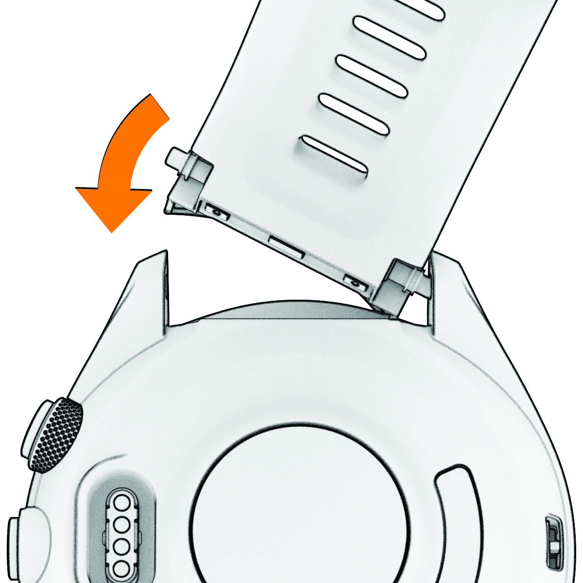 - Untuk memasang tali jam Approach S70 yang baru, selaraskan satu sisi tali jam baru dengan lubang pada jam tangan, dorong pin jam yang terbuka, dan tekan tali jam ke tempatnya.