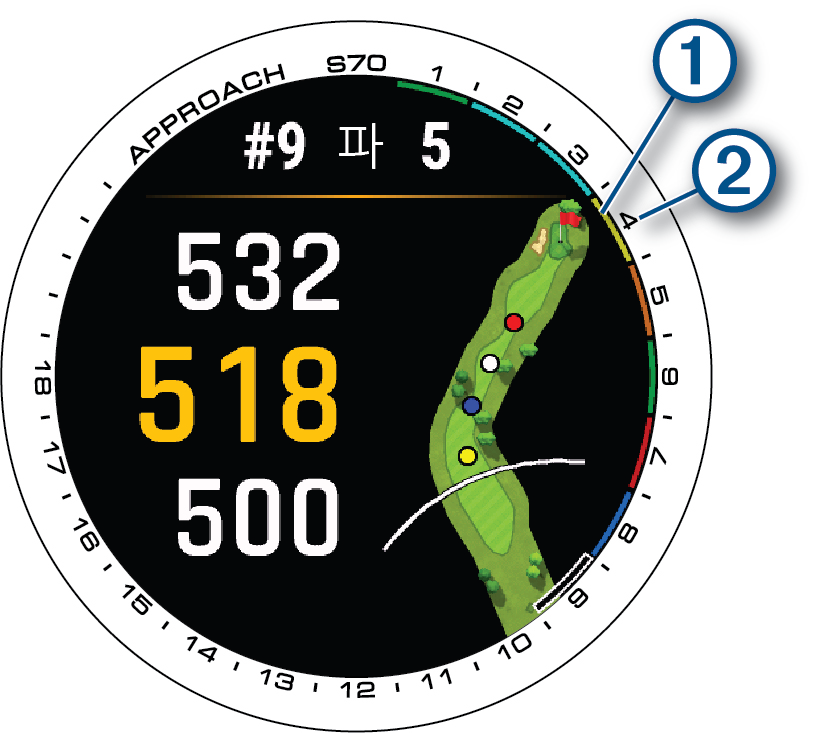 한 라운드를 플레이하는 동안, 워치 베젤을 따라 표시되어 있는 각 홀 인디케이터② 옆에 해당 홀의 스코어를 나타내는 색상①이 표시됩니다.
