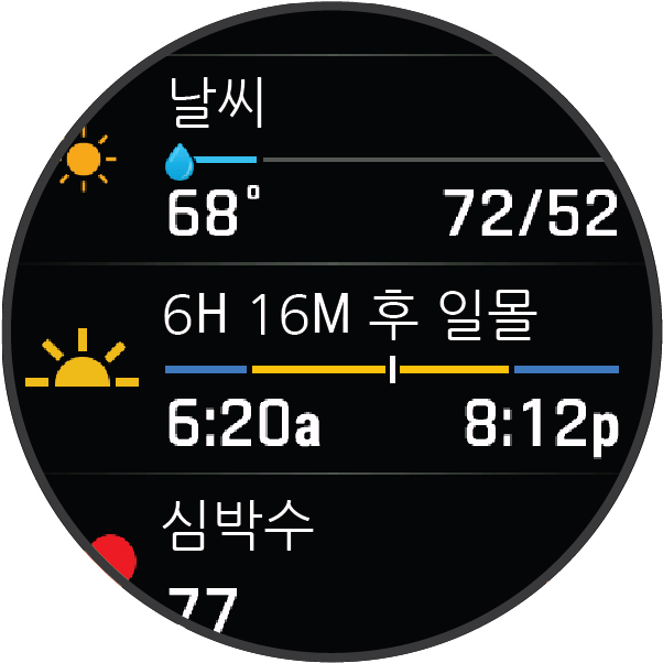 요약 정보는 건강 데이터, 활동 정보, 내장 센서 등에 대한 빠른 액세스를 제공합니다. 워치를 페어링하면 핸드폰에서 알림, 날씨, 캘린더 이벤트와 같은 데이터를 볼 수 있습니다.