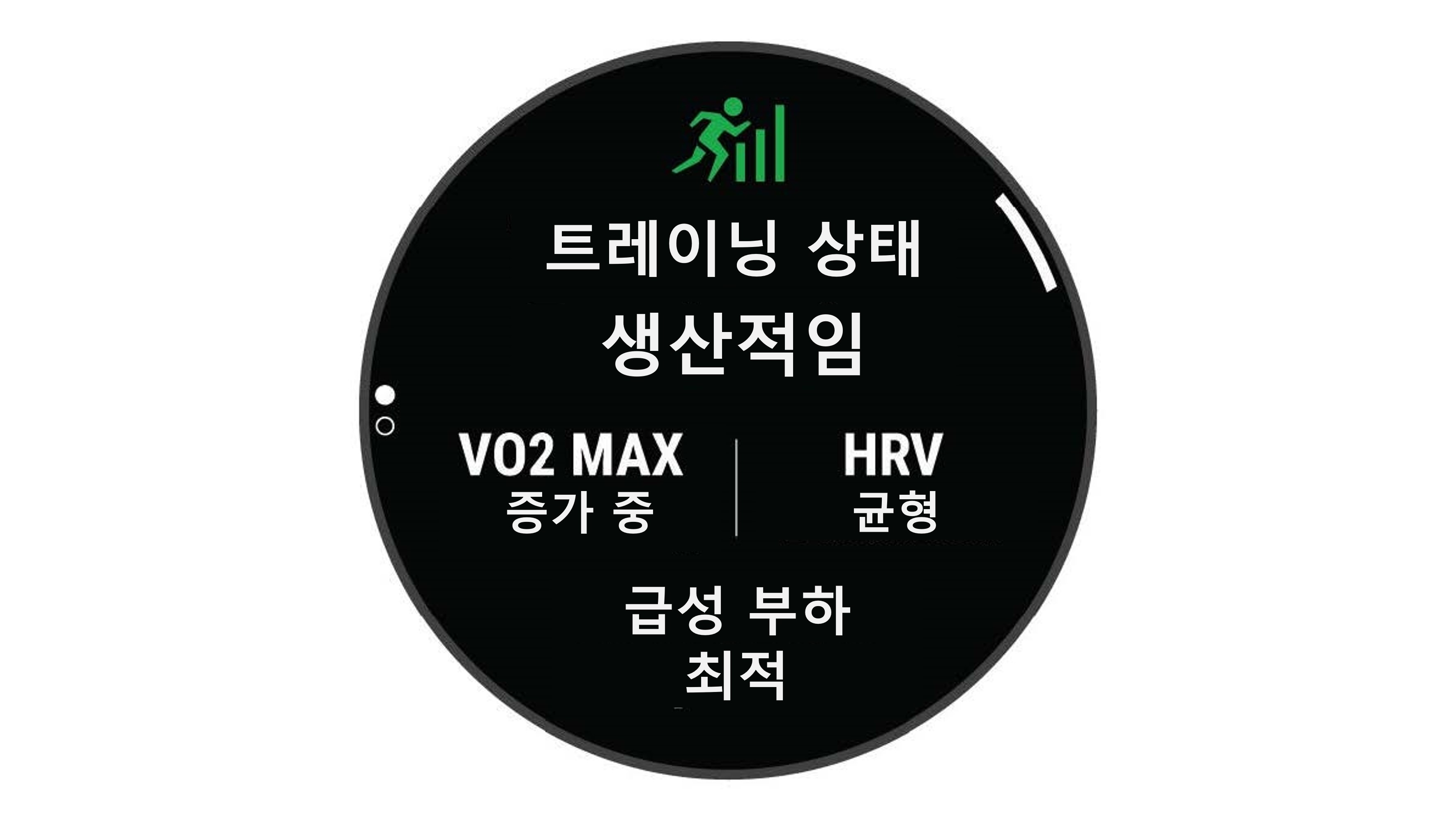 훈련 상태: 훈련 상태는 훈련이 운동능력과 성과에 어떠한 영향을 끼치는지를 보여줍니다. 훈련 상태는 장기간 동안의 훈련 부하와 최대 산소섭취량(VO2 max), HRV 상태의 변화를 기준으로 합니다.