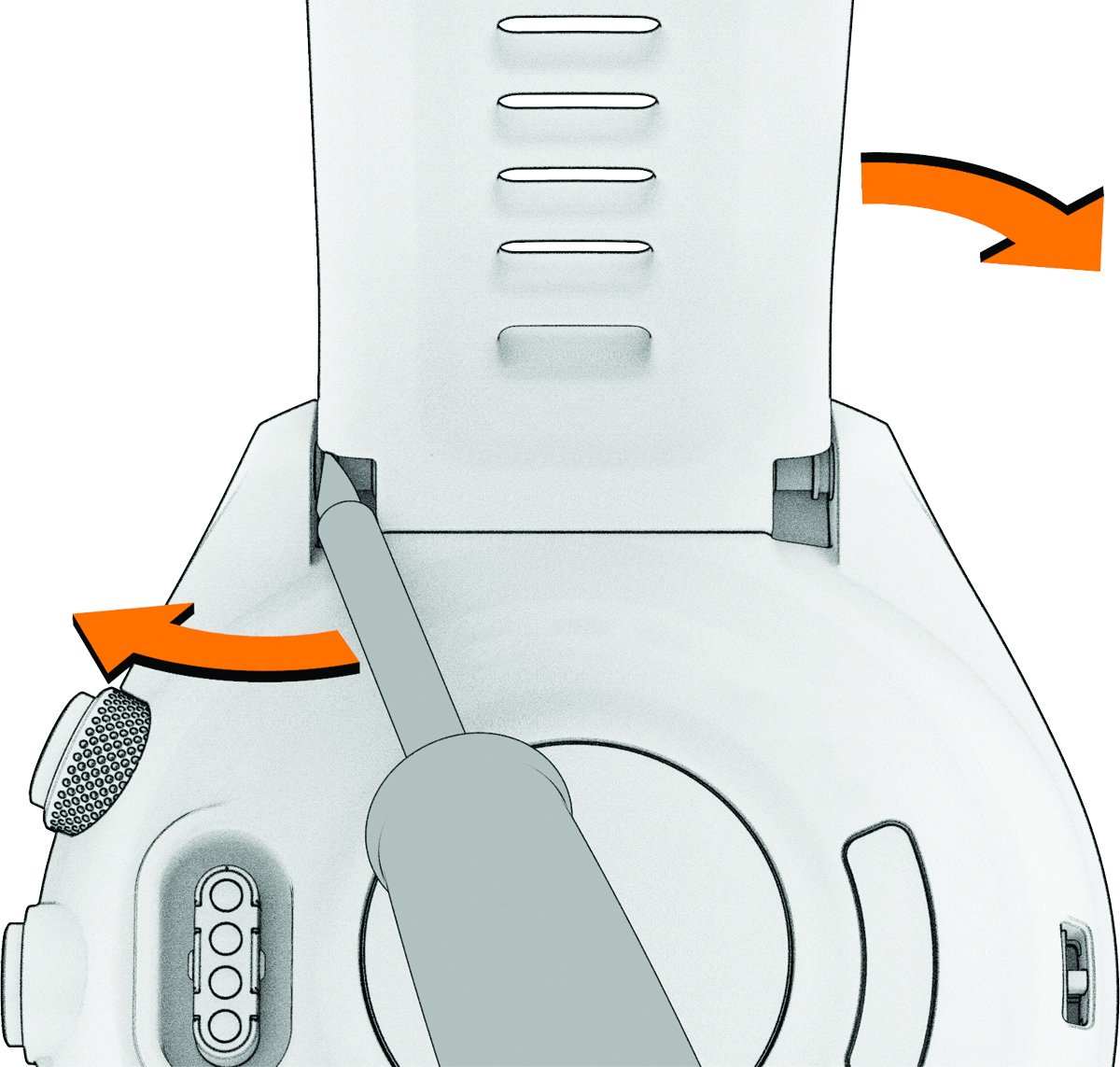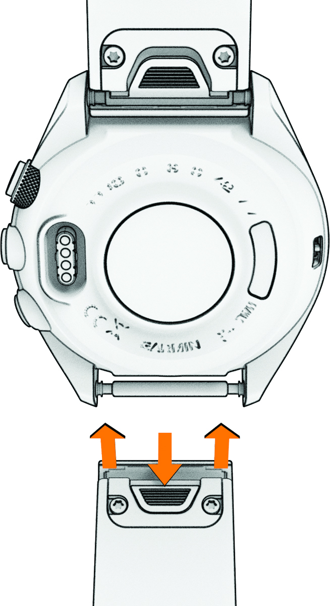 - เพื่อติดตั้งสายรัด QuickFit ที่ใช้งานร่วมกันได้ ถอดหมุดนาฬิกาจากสายรัด Approach S70 เปลี่ยนหมุดนาฬิกาบนนาฬิกา และกดสายรัดใหม่ให้เข้าที่