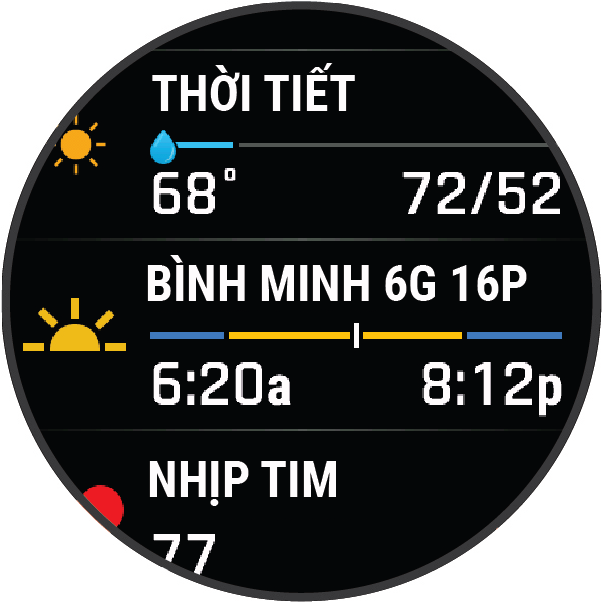 Công cụ tổng quan giúp truy cập nhanh vào dữ liệu sức khỏe, thông tin hoạt động, cảm biến tích hợp trên thiết bị và hơn thế nữa. Khi bạn kết nối đồng hồ, bạn có thể xem dữ liệu từ điện thoại của bạn, chẳng hạn như thông báo, thời tiết và sự kiện lịch.