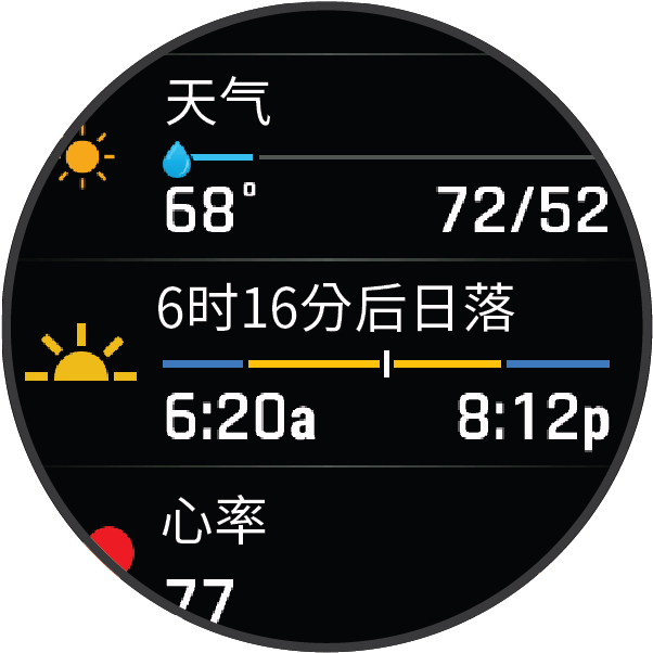 查看小工具概览列表概览可让您快速取用健康数据、活动信息、内建传感器等。腕表在配对后,即可查看手机的数据,例如通知、天气或行事历。 在时间表面,向上或向下滑。 腕表支持滑动概览小工具列表,并显示各概览的摘要信息。 轻触屏幕以查看概览中更多信息。 选择一个选项:向上或向下滑以查看概览的详细信息。按下开始键以查看小工具概览更多选项与功能。 自定义小工具概览列表主页小工具概览查看小工具概览列表