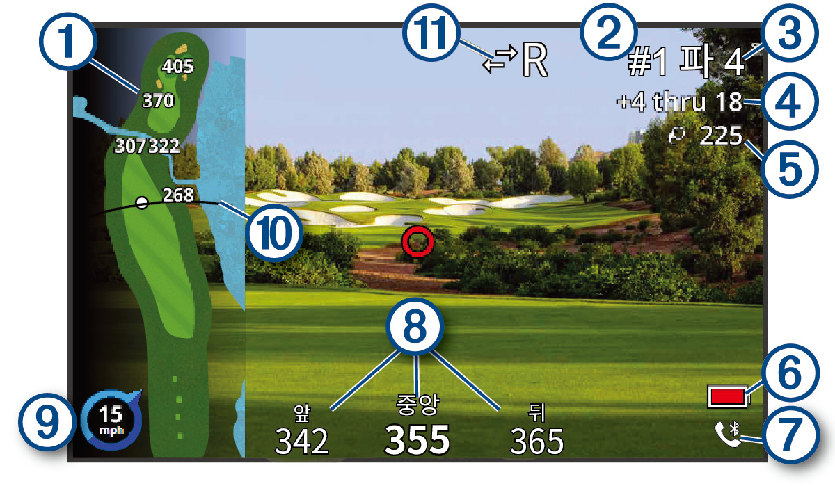 그린의 앞, 중앙, 뒤까지의 거리를 표시합니다. |