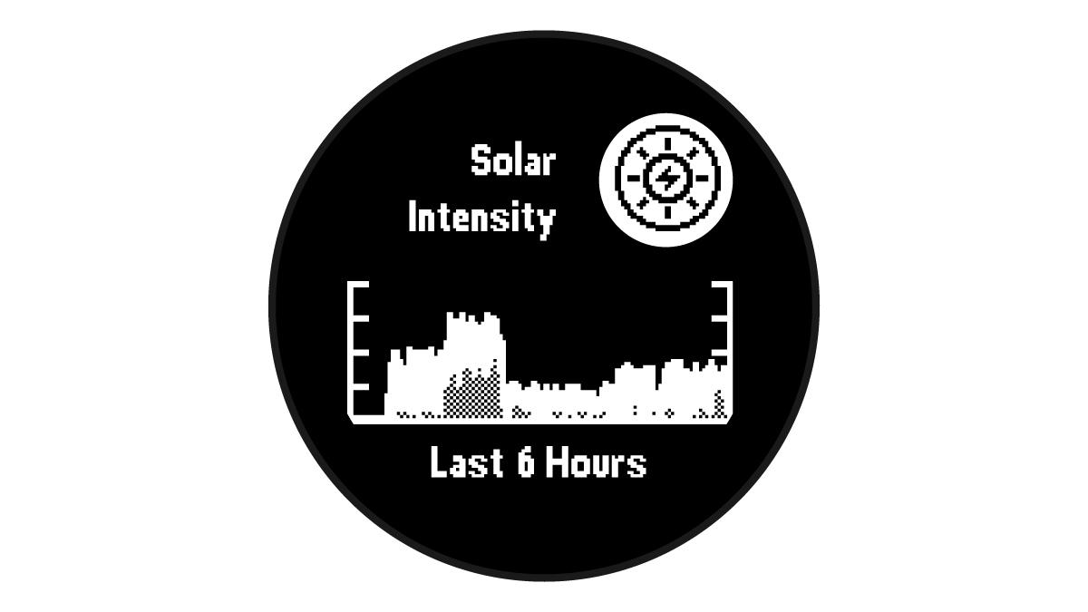 Viewing the Solar WidgetFrom the watch face, press UP or DOWN to scroll to the solar widget.A graph of the intensity of solar input for the last 6 hours appears.HomeSolar ChargingViewing the Solar Widget