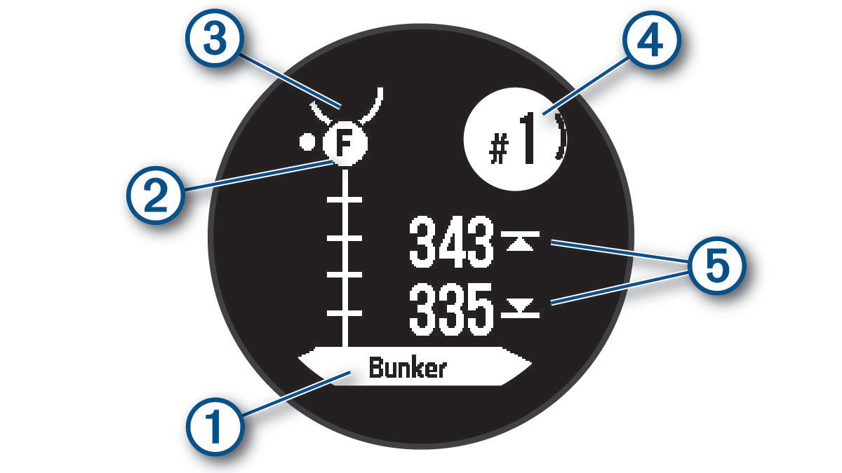 is listed at the top right of the screen. - The distances to the front and back ⑤ of the nearest hazard appear on the screen.