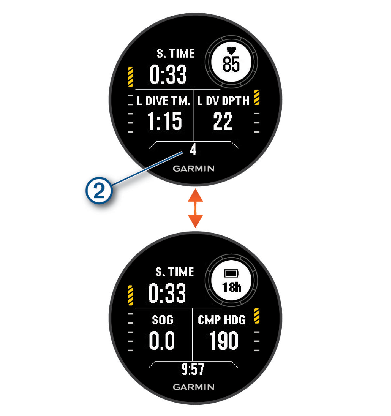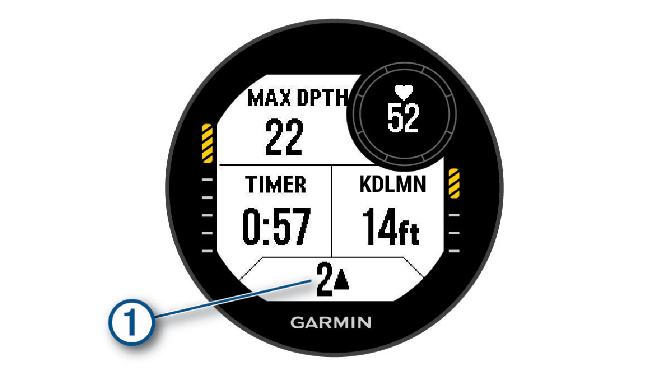 Layar saat menyelam: Menampilkan informasi tentang penyelaman terkini, termasuk waktu yang telah berlalu, kedalaman terkini dan maksimal, data denyut jantung, serta laju naik atau turun. Anda dapat mengedit tiga kolom data (Menyesuaikan Layar Data, halaman 21).