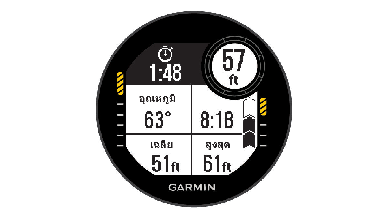 คำแนะนำ: คุณสามารถเพิ่มหน้าจอนาฬิกาจับเวลาแบบเรียบง่ายให้กับโหมดดำน้ำแบบใช้ถังแก๊ส (การปรับแต่งหน้าจอข้อมูล)