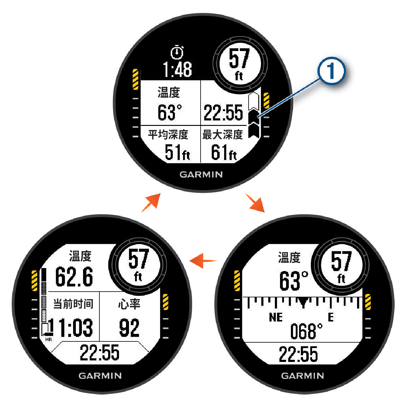 潜水罗盘:查看电子罗盘以及设置航向,帮助潜水员在水下导航(使用潜水电子罗盘导航,第7页)。
