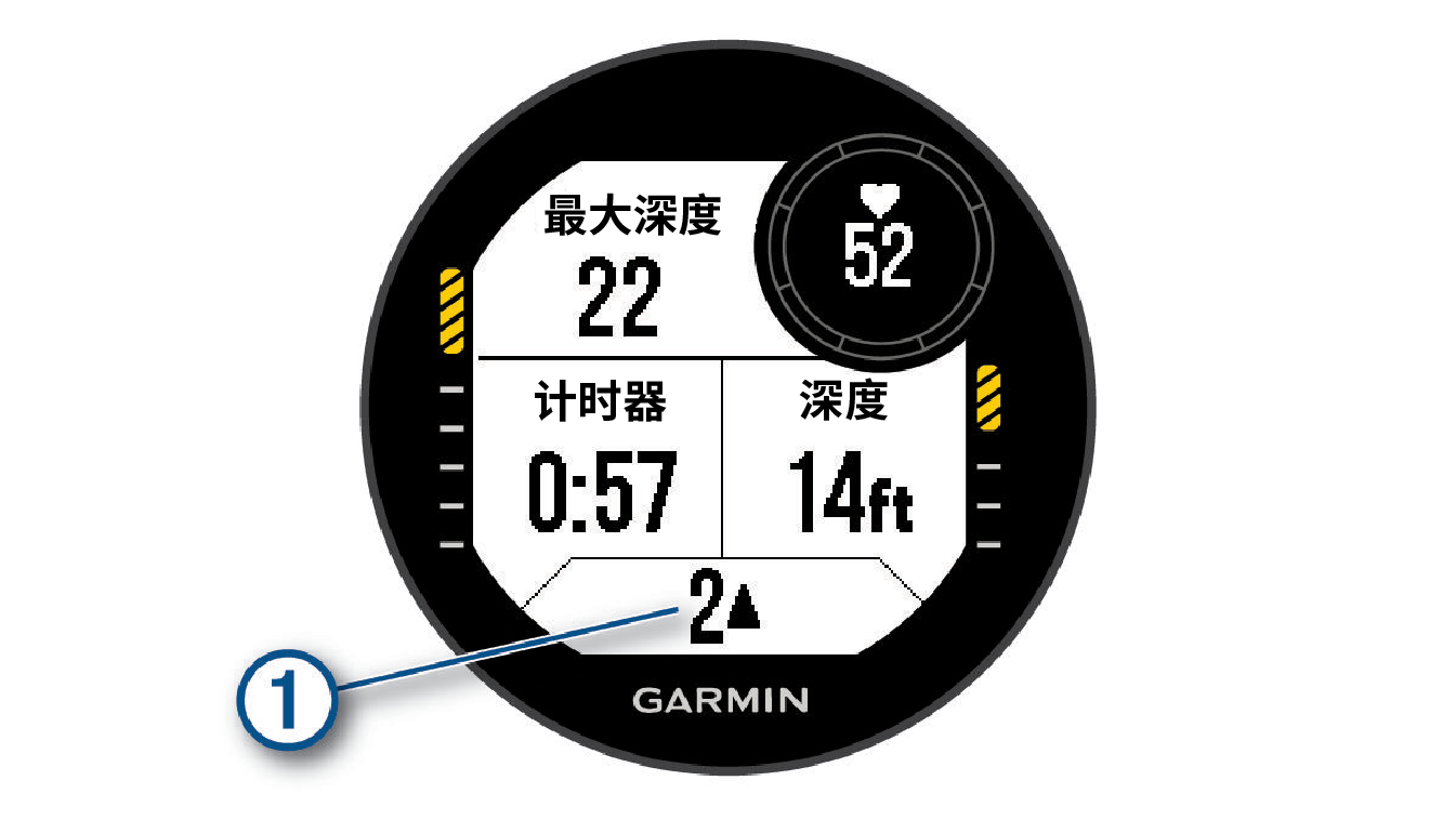 潜水页面:显示当前潜水相关信息,包括潜水时间、当前深度以及最大深度、心率、上升速率/下潜速率。可以编辑其中三个数据字段(自定义数据页面,第16页)。