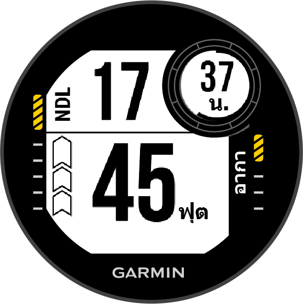 โหมดเลขขนาดใหญ่คุณสามารถเปลี่ยนขนาดของตัวเลขบนหน้าจอข้อมูลการดำน้ำแบบ single-gas หรือ multi-gas ได้ กดค้าง MENU เลือก กิจกรรมและแอป เลือก โหมด Single-Gas หรือโหมด Multi-Gas เลือกการตั้งค่ากิจกรรม เลือก เลขขนาดใหญ่ หน้าหลักการดำน้ำหน้าจอข้อมูลการดำน้ำโหมดเลขขนาดใหญ่