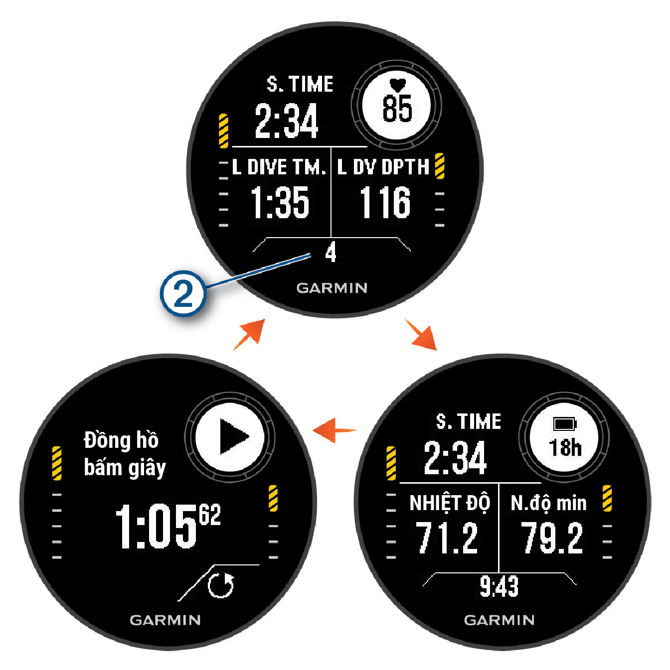 Màn hình lặn: Hiển thị thông tin về lần lặn hiện tại, bao gồm thời gian đã trôi qua, độ sâu hiện tại và độ sâu tối đa, dữ liệu nhịp tim và tốc độ ngoi lên hoặc lặn xuống. Bạn có thể chỉnh ba trong số các trường dữ liệu (Tùy chỉnh màn hình dữ liệu).