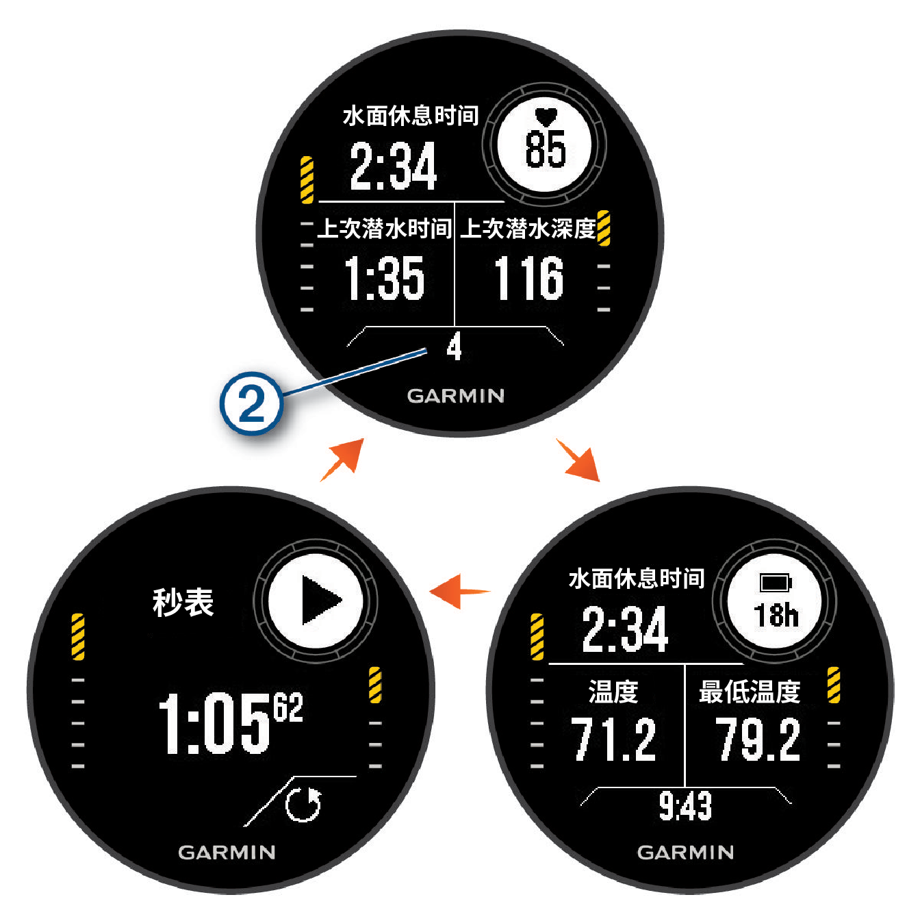 水面休息时间页面:显示当前水面休息时间、心率和上次潜水信息。可以编辑数据字段。