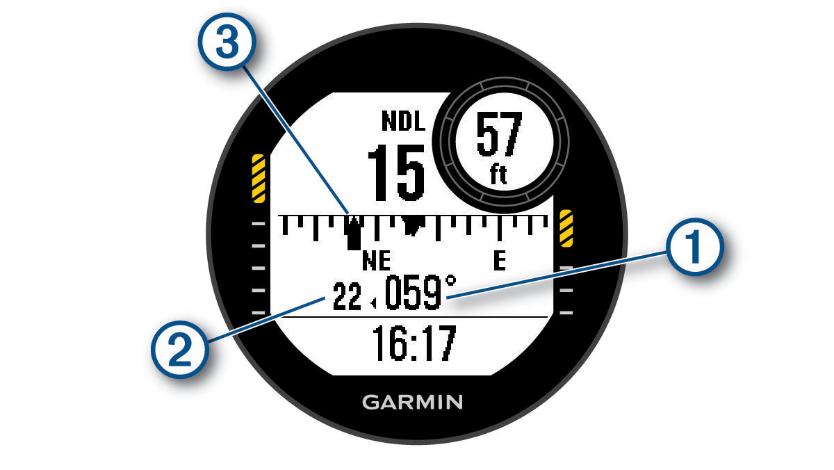 使用潛水電子羅盤導航 在單一氣體、多氣體、CCR、或儀錶潛水期間,捲動至潛水電子羅盤。 羅盤指向您目前方向 ①。 按下 START 鍵以設定導航方向。 電子羅盤會顯示與設訂的導航方向 ② 的偏差 ③。 按下 START 鍵,並選擇一個選項:要重新設定方向,選擇 重設方向。要 180 度改變航向,選擇 設為反向。備註:電子羅盤以灰色標記指示相反方向。要設定向左或向右 90 度的方向,選擇 設為90L 或 設為90R。要清除導航方向,選擇 清除方向。 首頁潛水開始潛水使用潛水電子羅盤導航