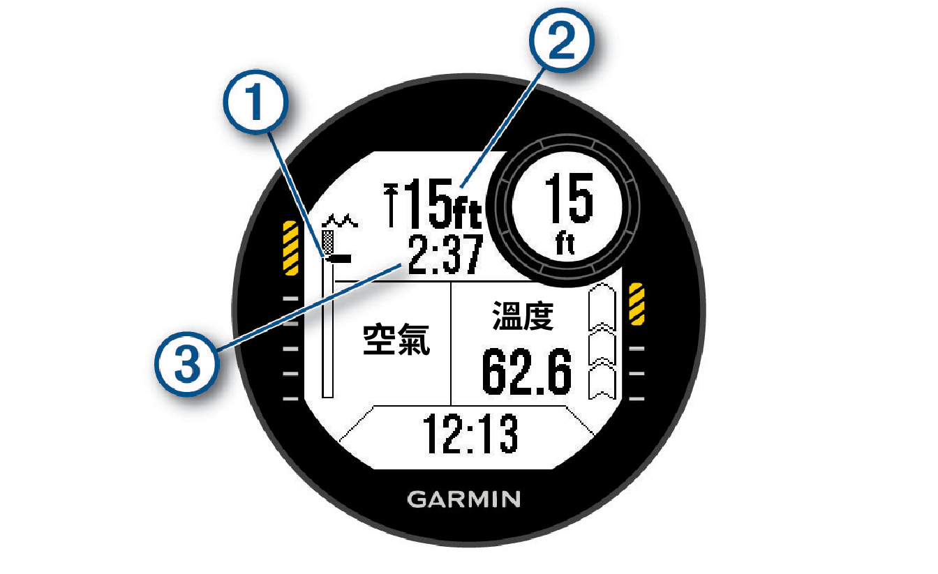 安全停留計時器。 當您在上限深度的 1 公尺(5 英尺)內時,計時器會開始倒數。 |