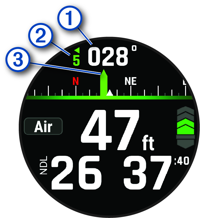 - During a Single-Gas, Multi-Gas, CCR, or Gauge dive, scroll to the dive compass.