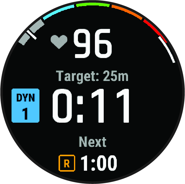 The in-dive screen for the pool apnea dive mode displays information about the current dive, including your current heart rate, target distance, training set, elapsed time, and a preview of the next step of the training activity. During surface intervals, you can press DOWN to view information about your last dive. You can press START to stop, change, or preview the current training activity or access the activity settings.