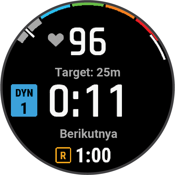 Layar penyelaman untuk mode selam pool apnea menampilkan informasi tentang penyelaman saat ini, termasuk denyut jantung Anda saat ini, target jarak, set pelatihan, waktu yang telah berlalu, dan pratinjau langkah pelatihan berikutnya. Selama interval permukaan, tekan DOWN untuk melihat informasi mengenai penyelaman terakhir Anda. Tekan START untuk menghentikan, mengubah, atau melihat pratinjau aktivitas atau membuka pengaturan aktivitas.