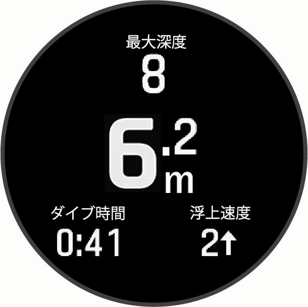 潜水中のダイビングページ:現在のダイビングの潜水時間、最大深度、心拍数、浮上/潜降のスピードを表示します。サーフェスインターバル中は、DOWNキーを押して、前回の潜水深度と潜水時間を確認したり、ストップウォッチを使用できます。( ベーシックダイビングストップウォッチを使用する)