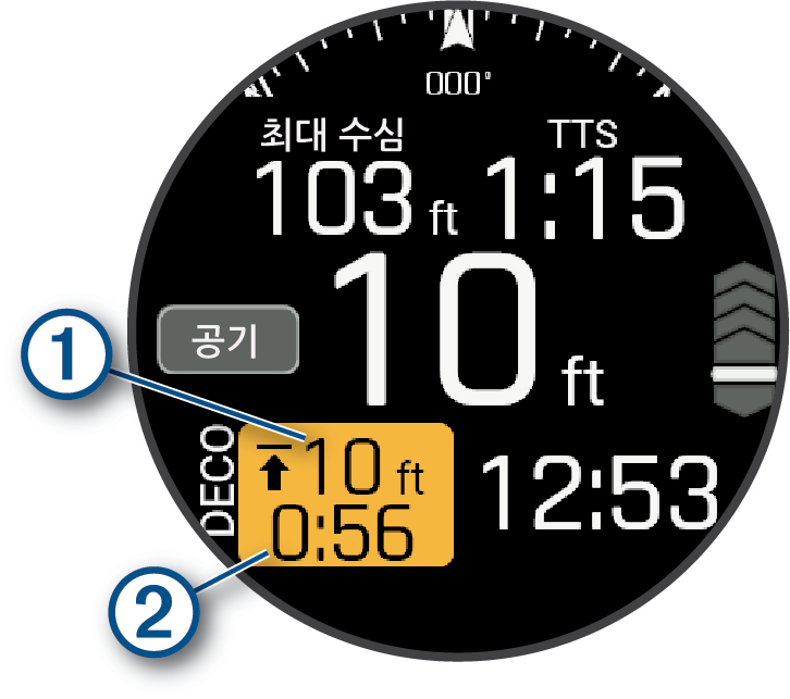 - 감압 정지 타이머가 0에 도달할 때까지 감압 정지 한계 수심으로부터 0.6 m (2 ft.) 이내에 머무세요.