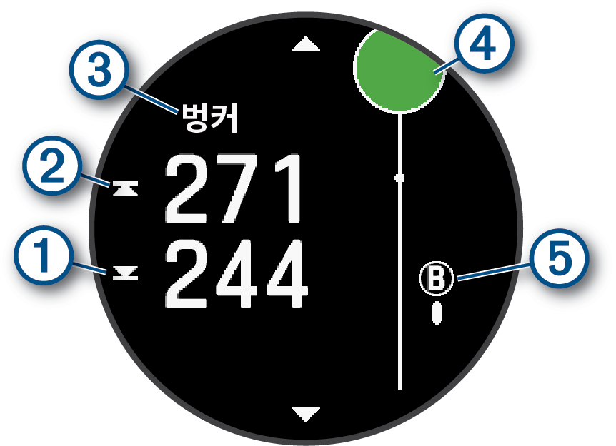 참고: 사용자가 파 3 홀에 위치하는 경우, 페어웨이 정보는 나타나지 않습니다.